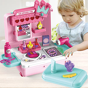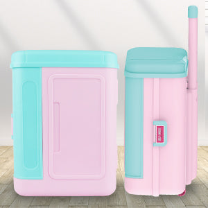 This adorable pink and blue makeup dresser suitcase transforms into a complete vanity station in seconds. With 35 colorful accessories, it lets kids style, organize, and play pretend just like grown-ups.