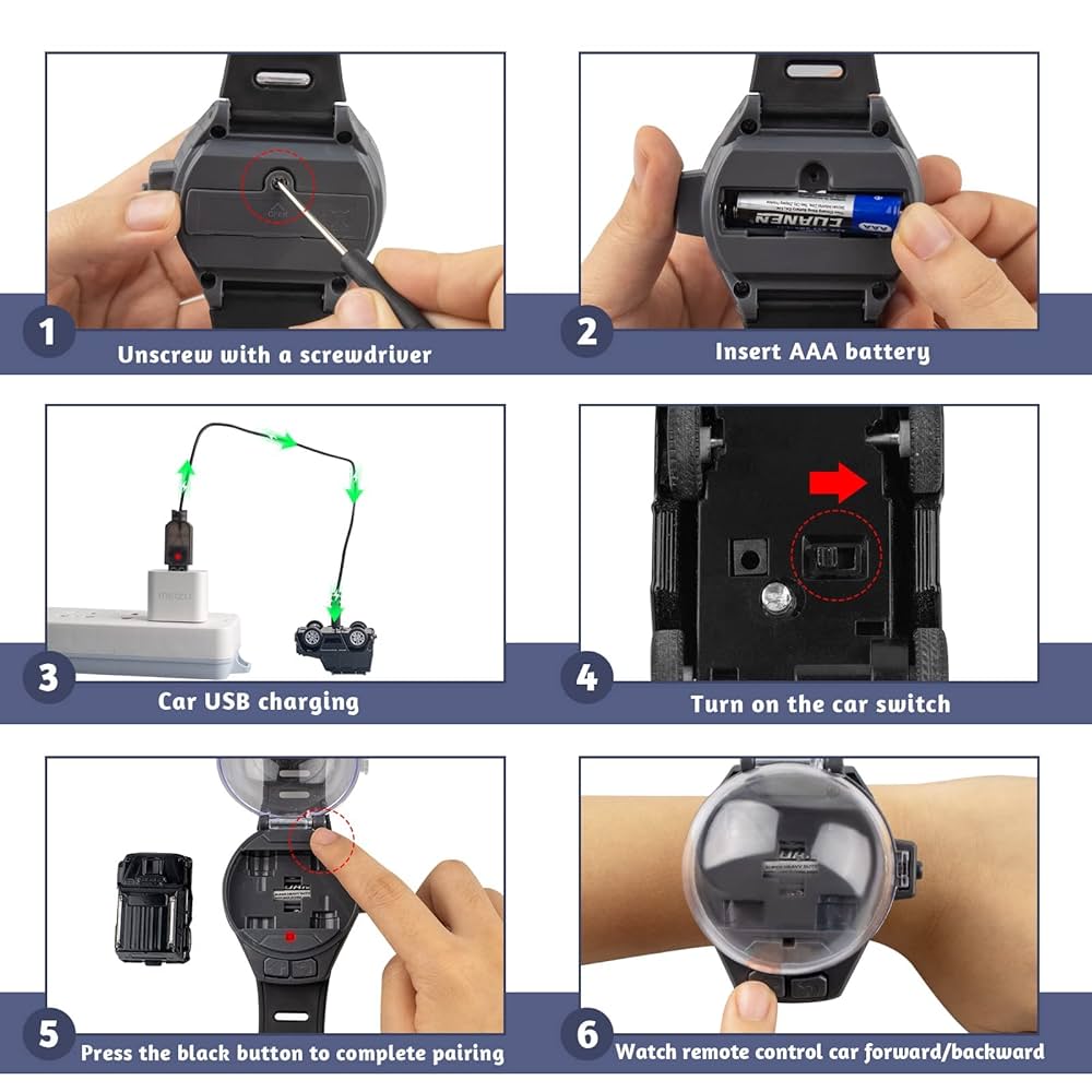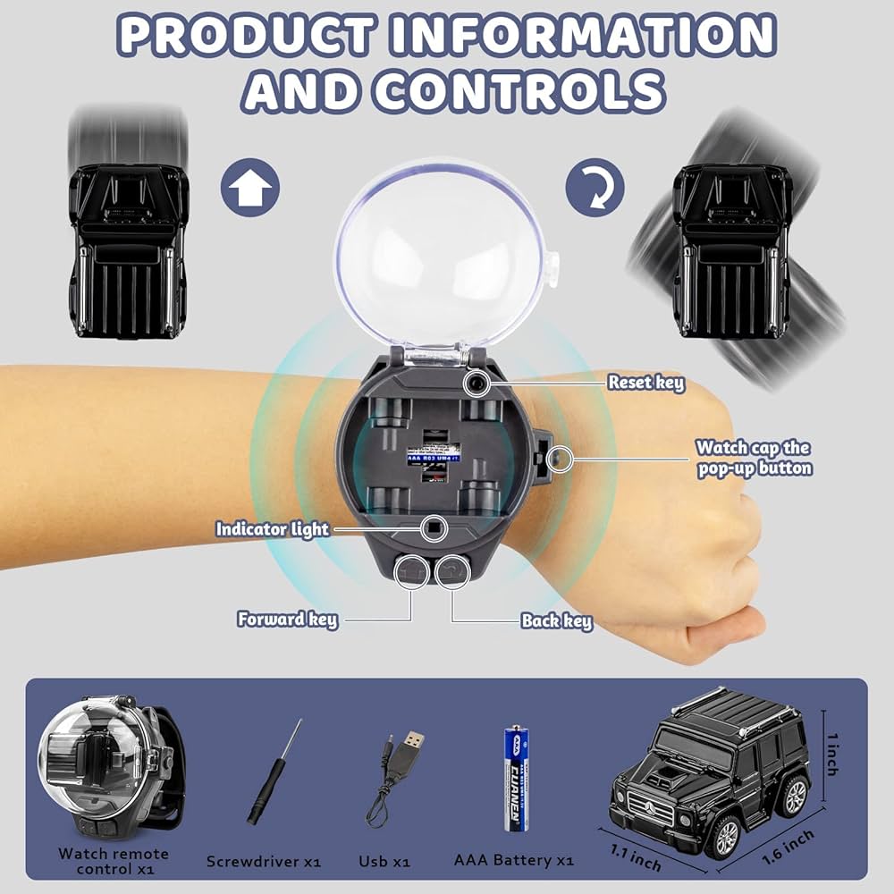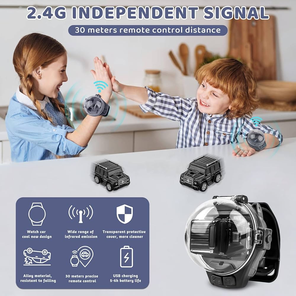 Turn every moment into a racing adventure and a fun, wearable remote-control toy that lets kids take their car anywhere! This innovative RC car comes with a 2.4GHz controller built into a wristwatch, making it both a stylish accessory and a high-speed racer. Compact and lightweight, it’s perfect for indoor play and on-the-go fun. Designed for children aged 3 and above, the watch RC car offers an exciting and interactive way to spark imagination and develop motor skills. A unique gift idea that combines fashion and function!