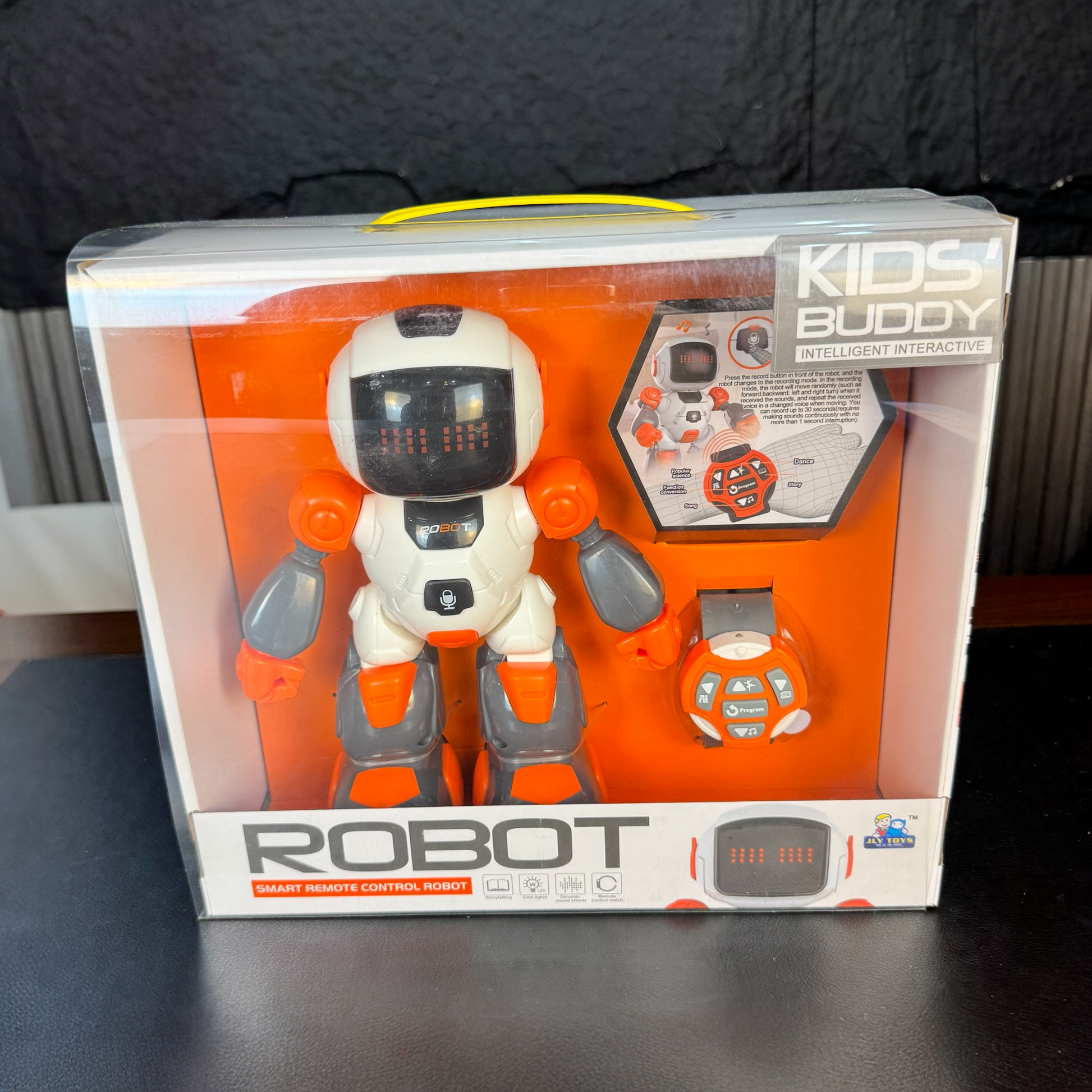 Watch-Controlled Movement – Command the robot with a cool wristwatch controller! It walks, plays fun sounds, and shows cute facial expressions.